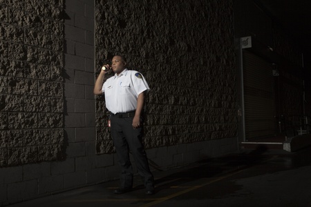 Security guard patrols at night with torch