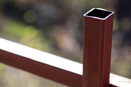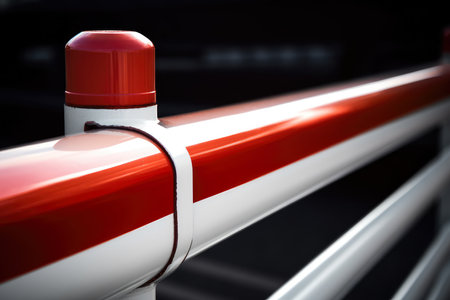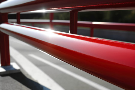 A detailed macro shot of a guardrail with a glossy red and white finish, indicating a no-entry zone