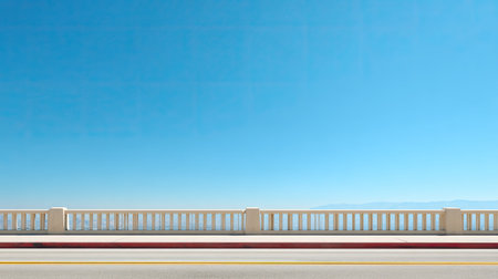 This image captures a tranquil waterfront scene featuring a clear blue sky and an elegant barrier. The bright sunshine enhances the calm atmosphere, ideal for creating a serene setting or illustrating travel and relaxation themes.