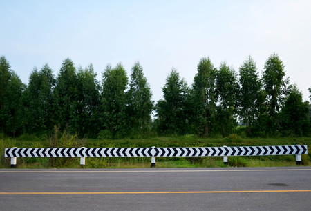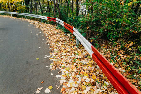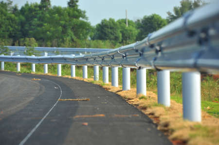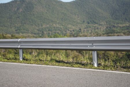 Asphalt road in a countryside with a metal railing or fence on a curve. Open road with trees around and focus on the safety barrier guard on the side.