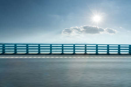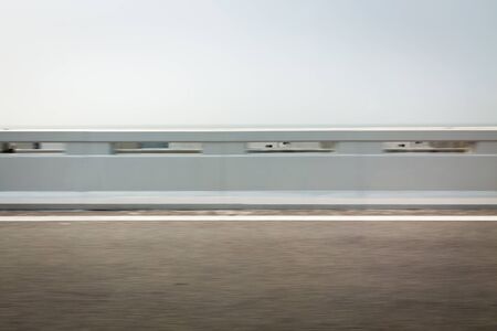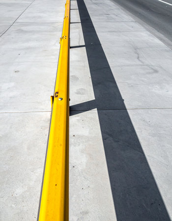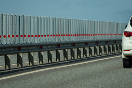 A low-angle, detailed view along a modern highway bridge guardrail on a bright, sunny day.