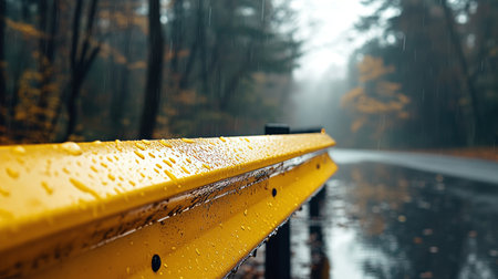 Close up of yellow guardrail on rainy day with reflection in raindrops and blurred forest background