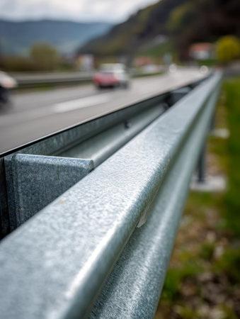 A detailed shot of a sturdy metal barrier along the road?s edge, with dynamic traffic flow blurring in the distance and a breathtaking natural backdrop beyond