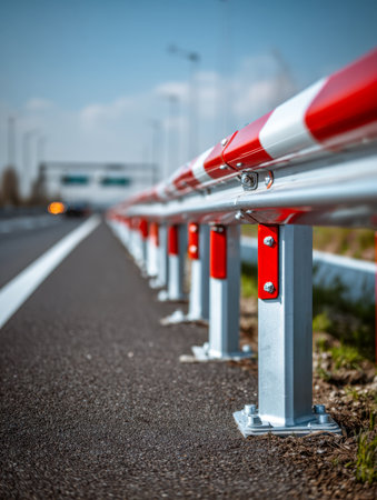Bright safety rails with vibrant red and white stripes line the highway's edge under a crisp blue sky, ensuring secure passage on a sunny afternoon.
