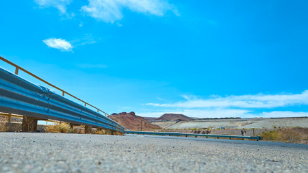 Aerial of Desert Road and Guardrail with Rolling Hills and Blue Sky