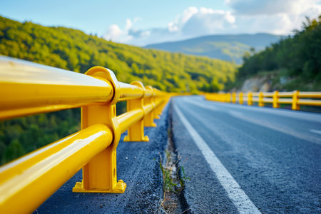 Vibrant Yellow Guardrail along a Scenic Mountain Road with Lush Greenery on a Sunny Day AI Generative