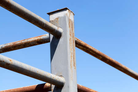 part of a column and a metal fence against a blue sky. modern fencing for cells in the zoo