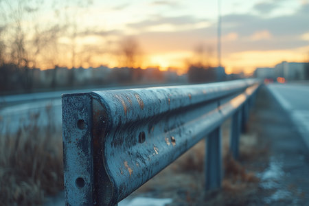 A detailed shot of a sturdy metal barrier along the road?s edge, with dynamic traffic flow blurring in the distance and a breathtaking natural backdrop beyond