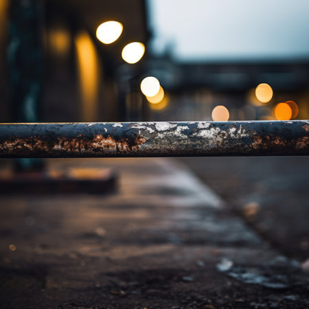 Rainy street with a rusty metal pipe, AI