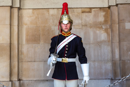 LONDON, UK - JUNE 17, 2022: Royal Horse Guards at The Household Cavalry Museum in London in a sunny summer day, UK