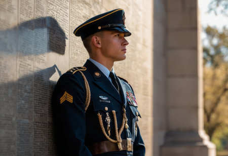 A military officer stands at attention, displaying discipline and service in a formal uniform.
