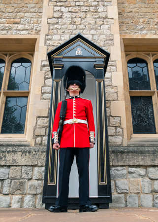 King's Life Guard in infantry uniform in front of Waterloo Block in Tower of London, London, England, UK. Tower of London is a UNESCO World Heritage Site since 1988.