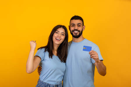 Overjoyed arab couple with credit card making YES gesture, promoting contactless shopping over yellow background
