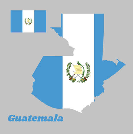 Map outline and flag of Guatemala and the country name, blue and white color with the national Emblem centered on white.
