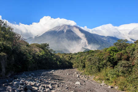 Colima Volcano in Mexico. Daytime landscape of Colima fire volcano with blue sky and white clouds.