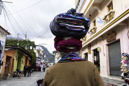The lady walks the streets of Panajachel carrying her clothes on her head.