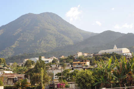 The city of Antigua in Guatemala at the foot of the Agua volcano.