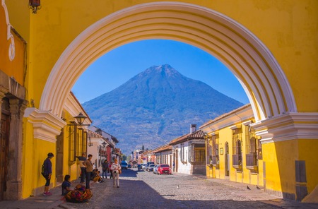 Ciudad de Guatemala, Guatemala, April, 25, 2018: Unidentified people walking in the streets of antigua city and view of active Agua volcano in the background through colorful yellow arch