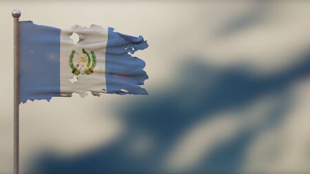 Guatemala 3D tattered waving flag illustration on flagpole. Isolated on blurred sky background with space on the right side. Depth of Field effect.