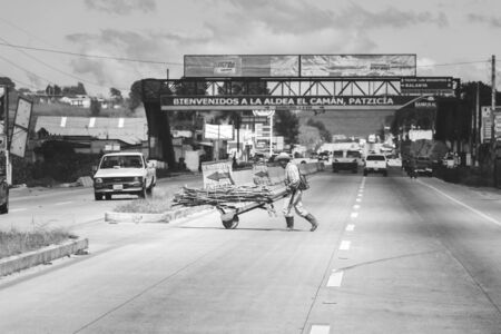 Man pushes whee barrow with bundle of wood across a busy road or highway in La Aldea El Caman, Patzicia, Guatemala.