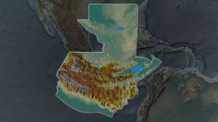 Guatemala area enlarged and glowed on a darkened background of its surroundings. Colored and bumped map of the administrative division