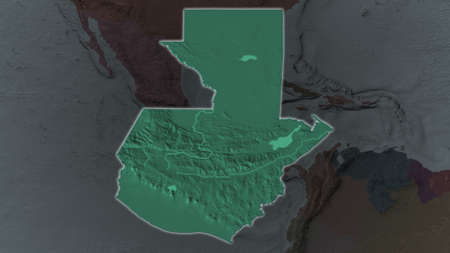 Guatemala area enlarged and glowed on a darkened background of its surroundings. Bilevel bumped elevation map