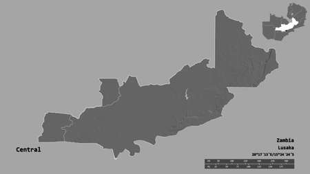 Shape of Central, province of Zambia, with its capital isolated on solid background. Distance scale, region preview and labels. Bilevel elevation map. 3D rendering