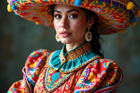 Portrait of a cheerful Mexican craftswoman wearing a vibrant, handcrafted hat, representing rich cultural heritage