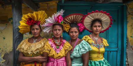 Four indigenous women in traditional dresses with colorful headdresses stand together