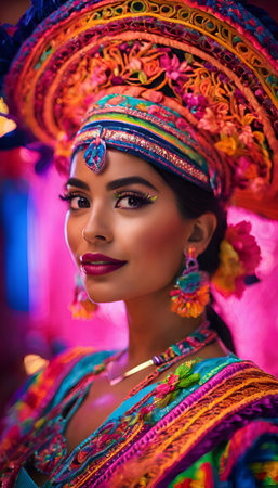 A Fabulous Cinco de Mayo female dancer neon light Beautiful female model traditional costume sombrero dancing