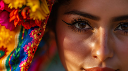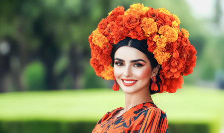 woman adorned vibrant floral headdress, showcasing Hispanic heritage through cultural celebration.
