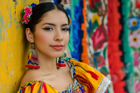 Portrait of a young woman in vibrant traditional Mexican attire against a textured backdrop