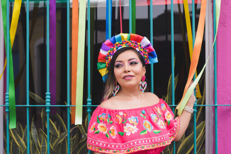 Hispanic woman in vibrant traditional Mexican dress and hat.