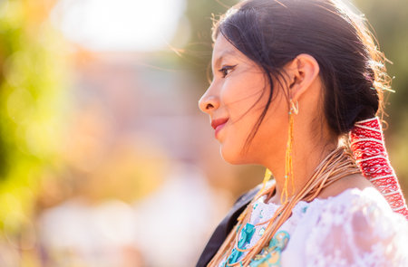 Indigenous woman wearing traditional clothes celebrating hispanic heritage. Dia de la hispanidad