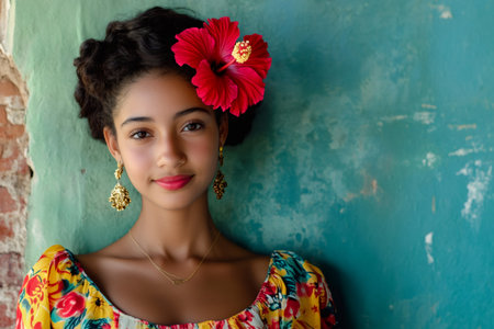Portrait of a beautiful young Latin woman with a hibiscus flower in her hair, posing against a vibrant turquoise wall
