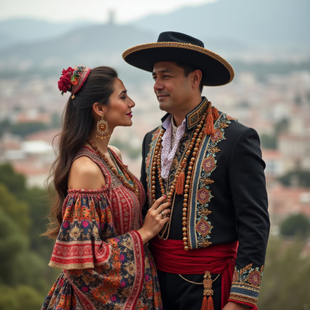 shot of a two people wearing traditional mexican clothing, created with generative ai