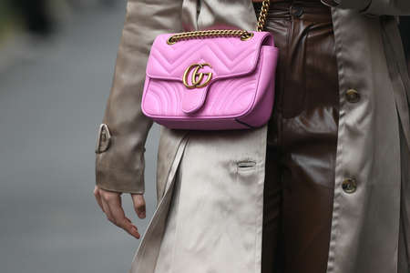 Milan, Italy - September 22, 2021: Street style outfit, fashionable woman wearing a pink Gucci purse, brown leather pants and a shiny coat on the streets of Milan, Italy.
