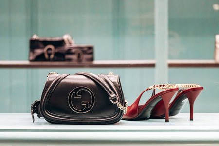 Bologna, Italy - October 6, 2024: Gucci bag and pumps in a boutique window