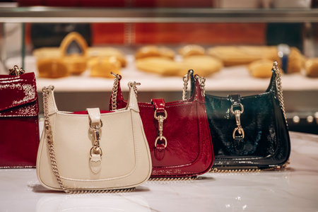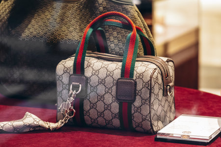 Nice, France - November 14, 2025: Gucci handbags displayed in a boutique window in Nice, France
