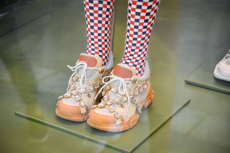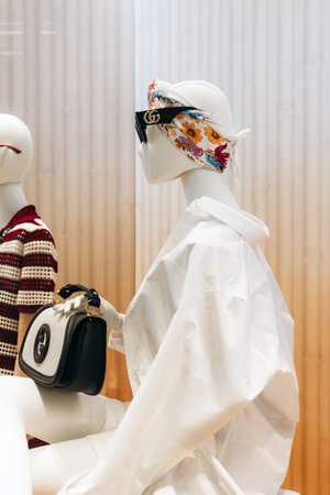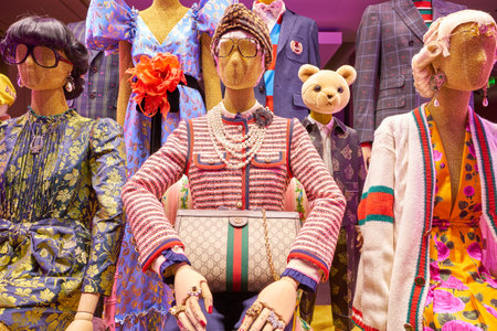 MILAN, ITALY - CIRCA NOVEMBER, 2017: display window at Gucci store in Milan. Gucci is an Italian luxury brand of fashion and leather goods.