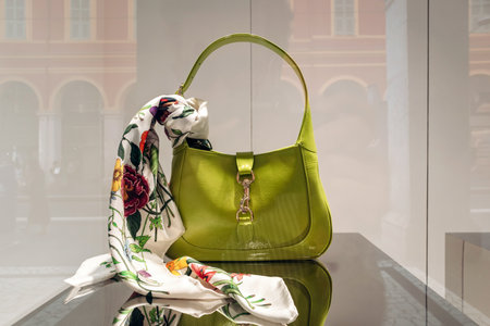 Nice, France - June 14, 2025: Green Gucci Jackie handbag with floral silk scarf displayed in the window of Galeries Lafayette