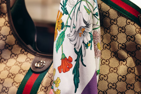 Nice, France – August 2, 2025: Gucci silk Flora scarf displayed with a Gucci monogram handbag in a luxury store window