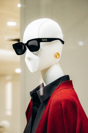 Nice, France - November 14, 2025: Gucci boutique mannequin wearing black sunglasses and red cardigan displayed in a luxury fashion store on Avenue Verdun in Nice