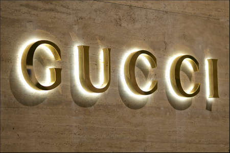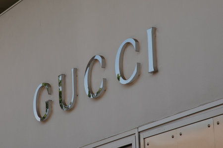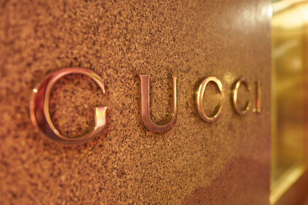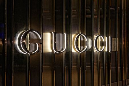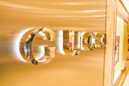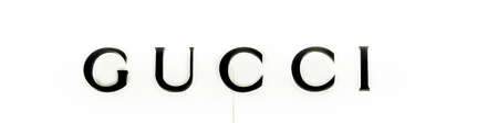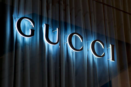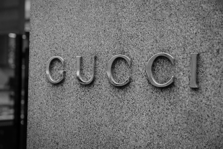 MILAN, ITALY - CIRCA NOVEMBER, 2017: close up shot of Gucci sign. Gucci is an Italian luxury brand of fashion and leather goods.