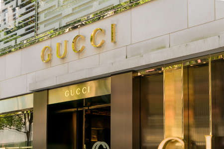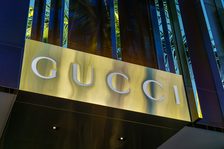 HONG KONG - JANUARY 27, 2016: Gucci logo on the wall at Elements Shopping Mall. Gucci is a luxury Italian fashion and leather goods brand, part of the Gucci Group