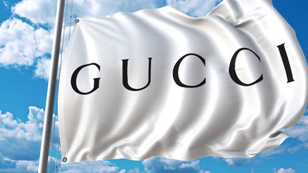 Waving flag with Gucci logo against sky and clouds. Editorial 3D rendering
