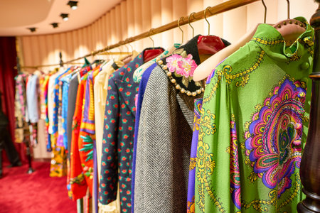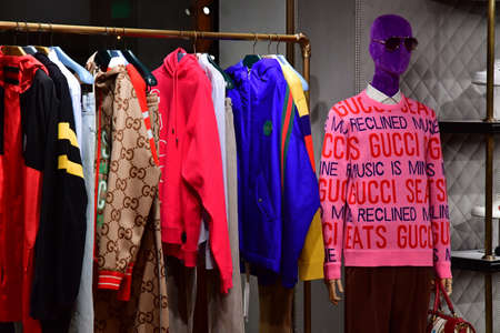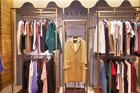 MILAN, ITALY - CIRCA NOVEMBER, 2017: various of Gucci clothes on display at Rinascente. Rinascente is a collection of high-end stores.