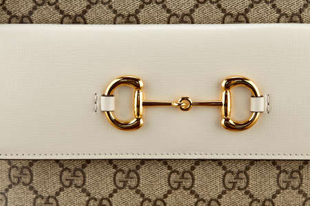metal Gucci buckle on light beige leather serves as a decoration for Gucci textile bags with an embroidered logo arranged in a checkerboard pattern. Belarus, Minsk, 25.03.2021.