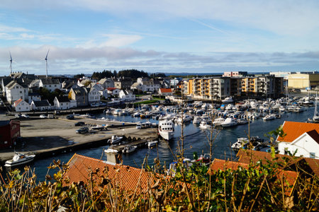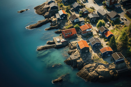 Aerial view of fishing village in Norway, Scandinavia, Europe.