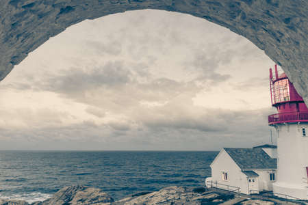 Historic red white lighthouse on the edge of rocky sea coast, South Norway, Lindesnes Fyr beacon